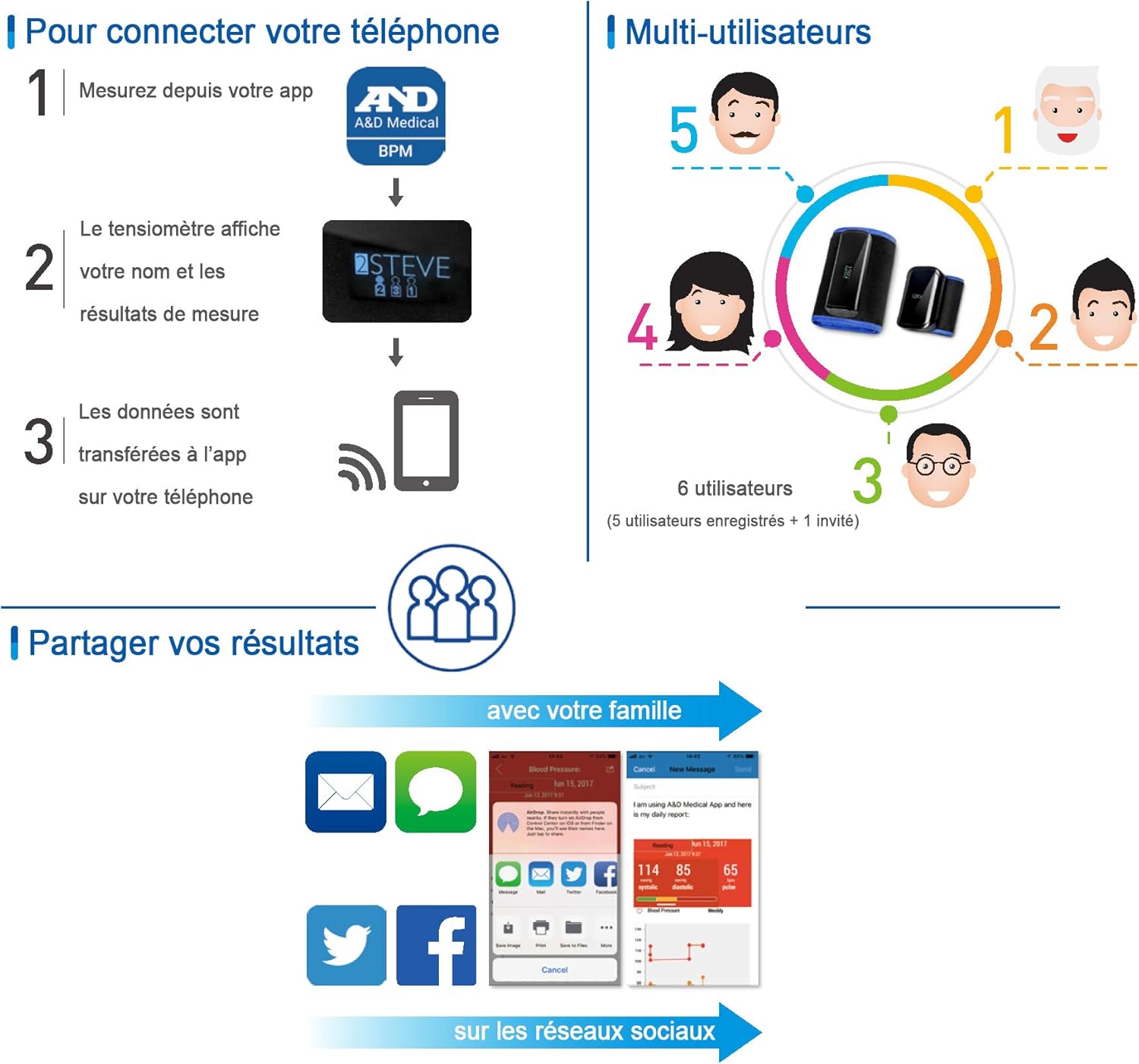 "The UA-1200BLE is the lightest hoseless and wireless upper-arm blood pressure monitor(BPM) on the market. Conventional upper arm blood pressure monitors cannot easily be used outside of the home because they are too big and bulky. The UA-1200BLE is very compact, light, and hoseless, so you can bring a blood pressure monitor with you, wherever you go. Measurement can be started using either an app or the monitor itself. Starting from the app allows you to see instructions and progress on your mobile device. The UA-1200BLE allows up to 5 users and 1 guest, so one device can work seamlessly for an entire family. An unlimited amount of readings can be stored on the A&D Connect app. Of course, you can also share your data with your family."