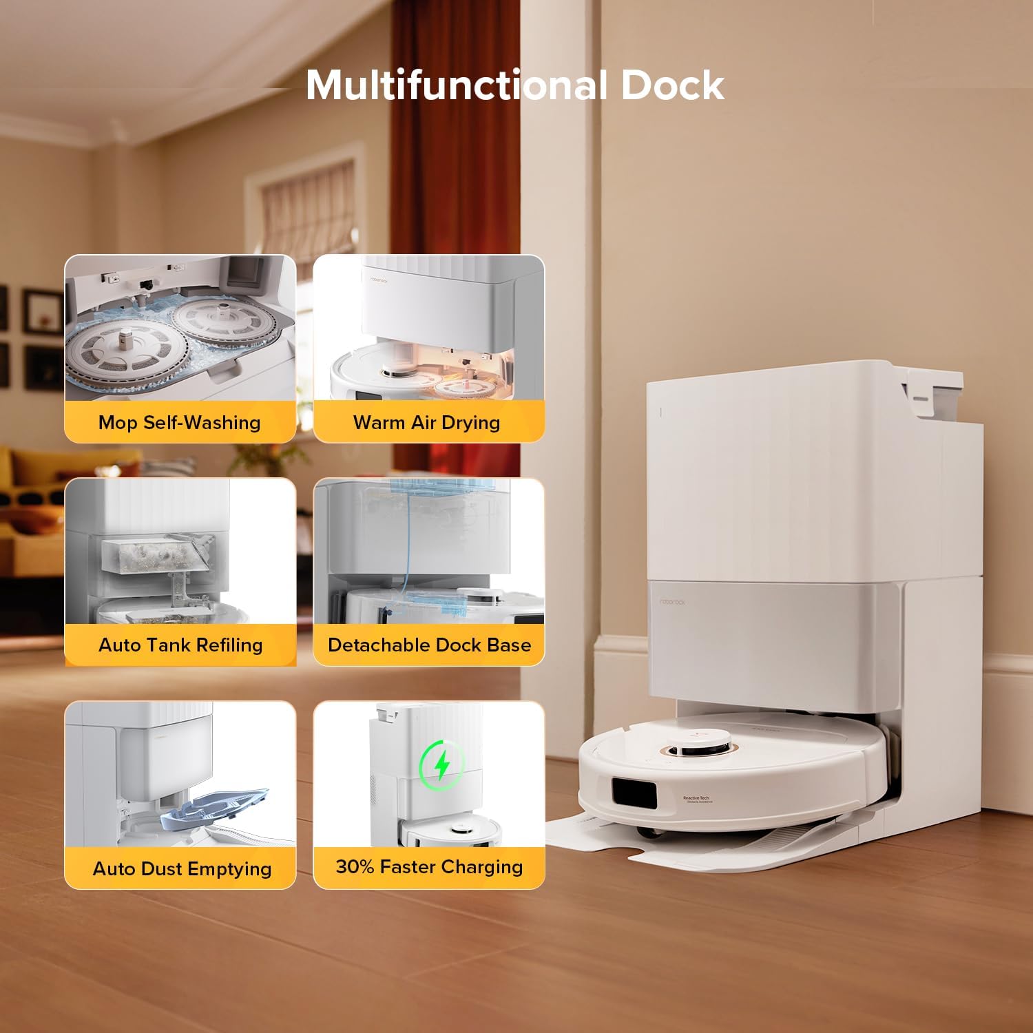 - All-in-One Smart Dock with Warm Air Drying – Revolutionize hands-free cleaning: auto-empties dust into a 7-week storage bin, self-washes mops, and uses hot air drying to prevent odor. Auto-refills the water tank for uninterrupted mopping across 3,552 sqft—perfect for large homes.